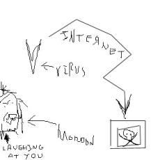 In case you don’t get it, The V stands for virus (Mordon’s idea). It goes through the internet when you least ekspect it. The skull signifies the distruction of your computer by Mordon’s virus.